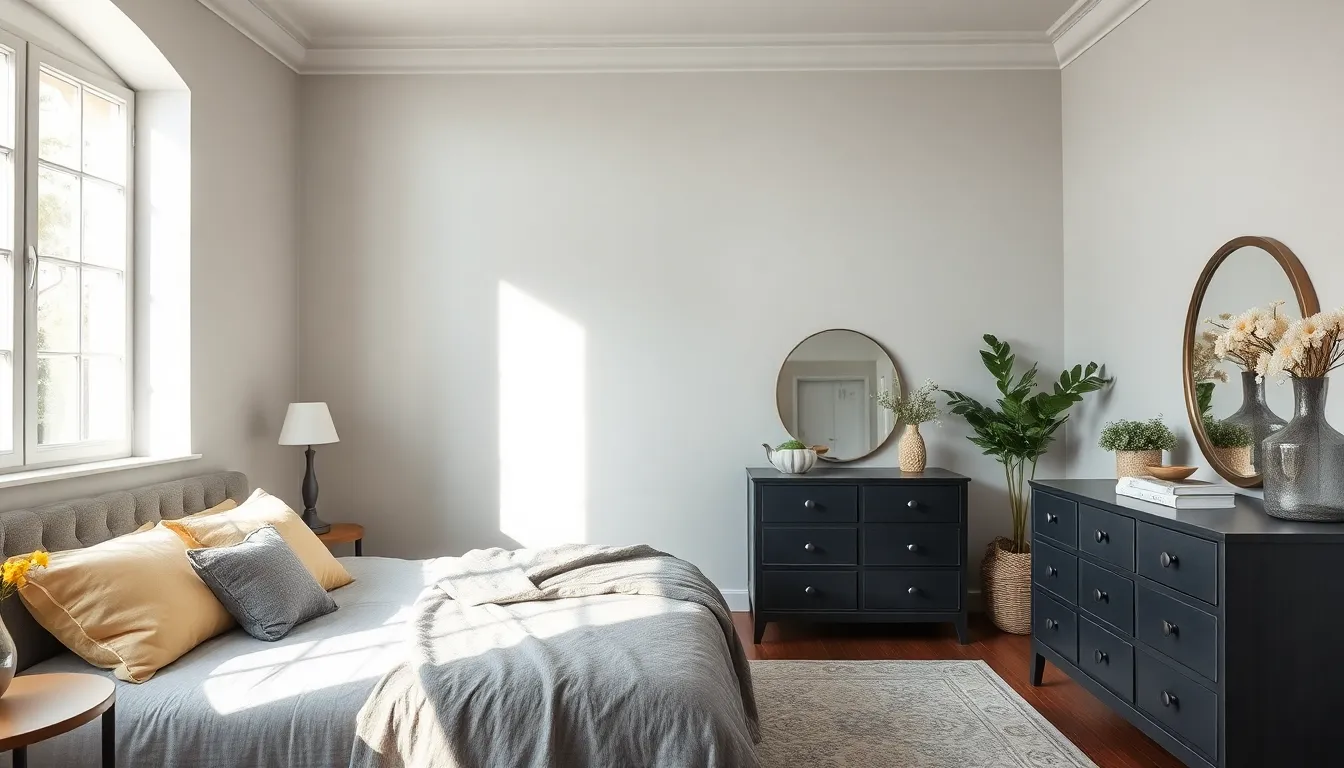 Modern minimalism emphasizes clean lines and simplicity. Grey, in shades like soft dove or concrete tones, creates a calming environment that aligns well with this style. Neutral furnishings complement grey walls or bedding, maintaining a cohesive look. Natural light plays a vital role, enhancing the subtle variations in grey and softening the room’s overall mood. Incorporating storage solutions such as sleek dressers can help reduce clutter, ensuring a serene space. Statement pieces, like a large abstract artwork, can add interest without overwhelming the room’s calm ambiance.
