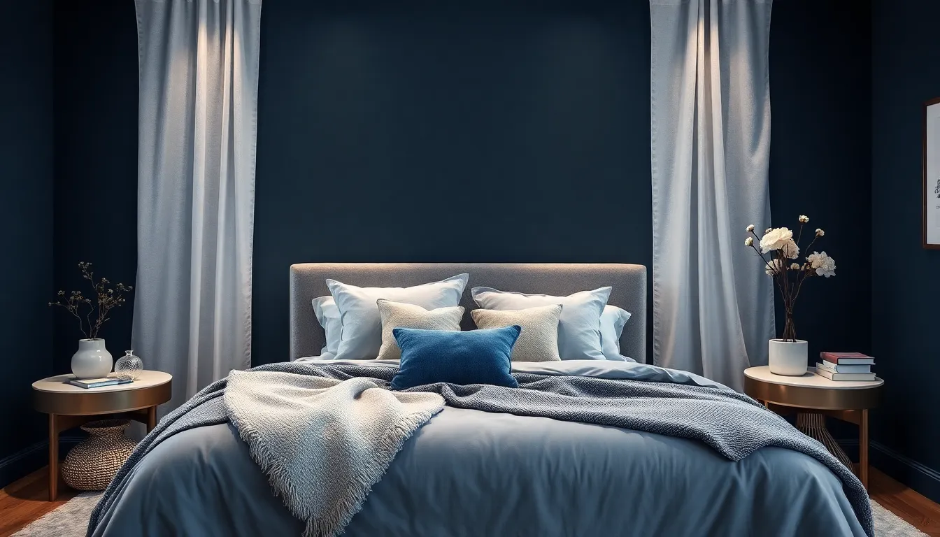 Navy blue adds depth to bedrooms, creating an illusion of spaciousness. The darker shade draws the eye, making walls seem farther away, which contributes to an expansive feel. Accessories in varying textures, such as velvet and linen, further enhance this effect, adding layers to the design. Accent walls transformed with navy blue paint create striking focal points that enrich the overall aesthetic. These features combine to create a visually appealing environment, making the space feel both elegant and dynamic.
